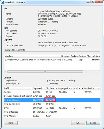 點(diǎn)擊菜單“Statistics/Summary”,得到每秒NTP響應(yīng)數(shù)量