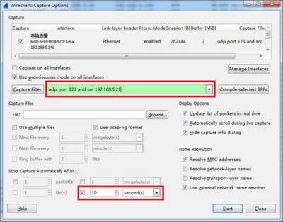 開(kāi)啟wireshark,設(shè)置捕獲參數(shù)(“Capture Options”),選中“本地連接”,并設(shè)置過(guò)濾器和停止時(shí)間,并點(diǎn)擊“Start”,如下圖所示: